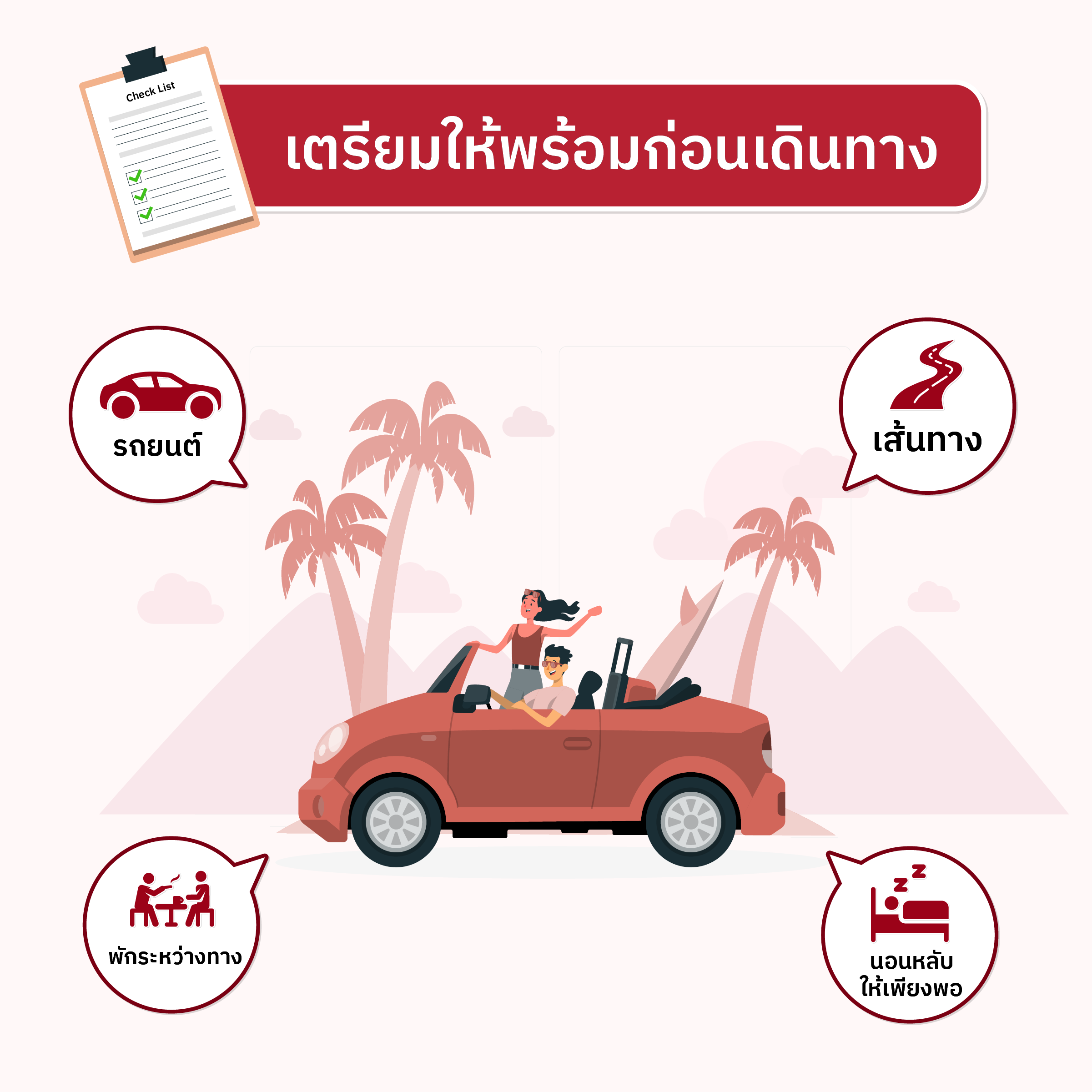 1. รถยนต์ : ควรตรวจเช็กสภาพรถก่อนเดินทาง เช่น ยางรถ, น้ำมันเครื่อง, แบตเตอรี่, ไฟหน้า-ไฟท้าย, น้ำหล่อเย็น